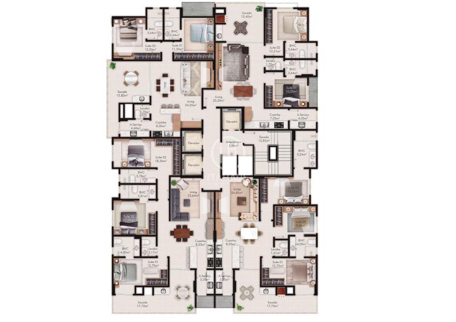 Planta Tipo 01 - 3 Suítes: Área privativa 122m²