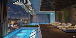 Piscina com espelho d' agua, estar, spa e bar molhado